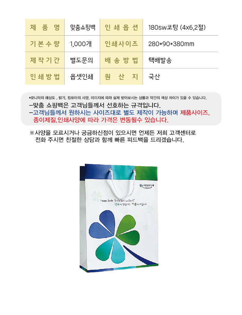 | 기타사항 | •180sw 코팅 •기본수량 1,000개 •Size : 280x90x380 mm |